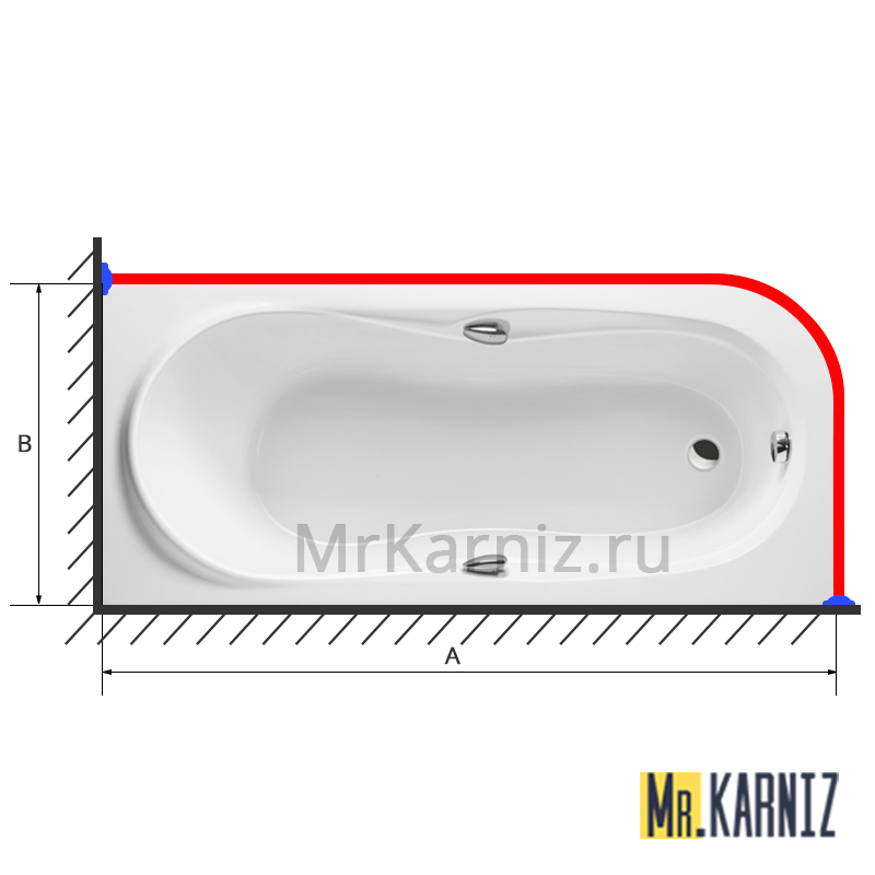 Самые простые для самостоятельного замера это карнизы для ванн Г образной и П образной формы. Для их изготовления нам необходимо знать лишь длину и ширину ванны. На схеме они обозначены символами "А" и "В"