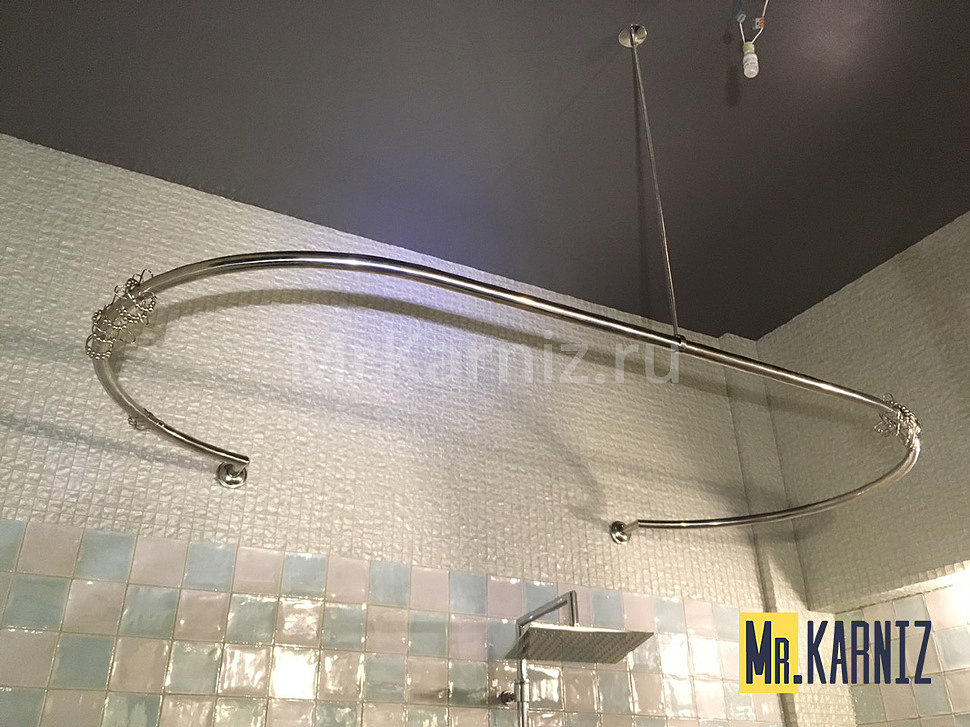 Шторы в серийном производстве идут двух размеров: 180 см и 200 см. Соответственно карниз вам необходимо устанавливать на высоте либо 140-150 см, либо 160-170 см от верхнего края ванны.